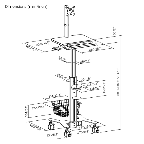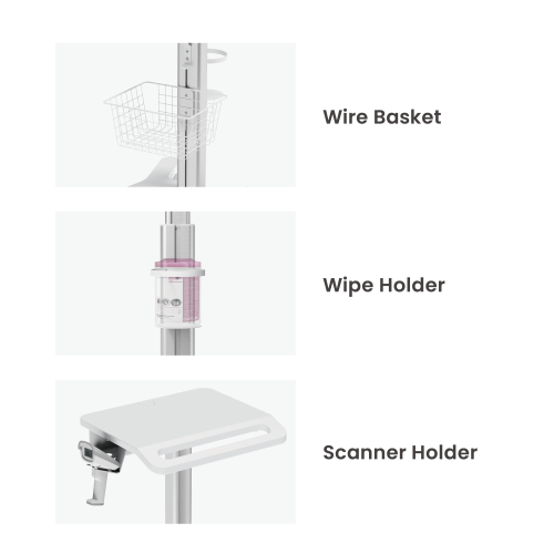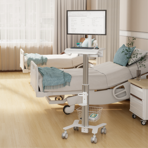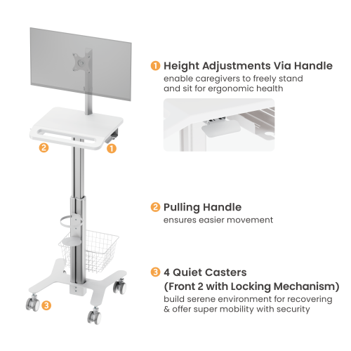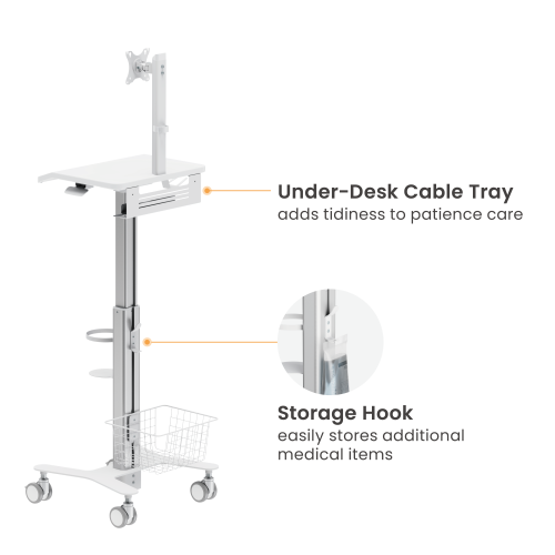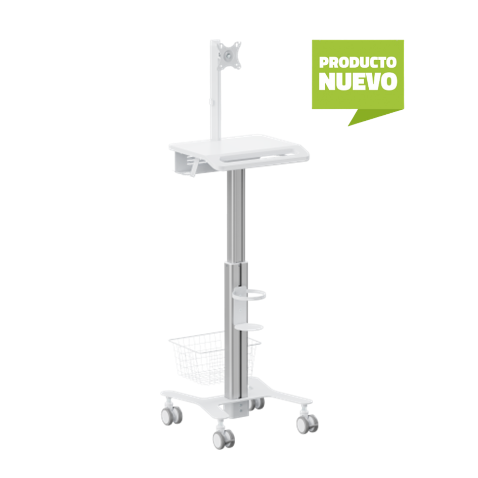 Características: Carro médico modular ajustable en altura y con soporte para monitor.