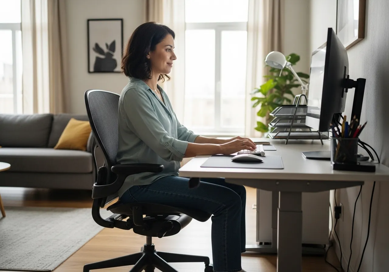 Sabemos que pasas gran parte del día sentado frente a una pantalla, y hacerlo sin las condiciones adecuadas pasa una factura silenciosa pero costosa a tu cuerpo. En Ergo & Health, queremos que entiendas cómo tu entorno influye en tu bienestar integral. Por eso hemos preparado esta guía con ajustes que puedes aplicar hoy mismo. Acompáñanos a descubrir las claves esenciales para transformar tu espacio. Ya sea en la oficina o en casa, convierte tu lugar en un entorno seguro, eficiente y saludable. ¿Qué es un puesto de trabajo ergonómico?Este concepto supera el simple hecho de tener una silla costosa. Se trata de un sistema integral donde mobiliario, tecnología y ambiente se ajustan a ti. De este modo, el objetivo principal de un puesto de trabajo ergonómico es mantener una alineación natural durante toda la jornada. Un diseño adecuado debe liberar de tensión tus articulaciones. Por ejemplo, al sentarte, tus pies deben estar planos sobre el suelo. Esto asegura tu estabilidad pélvica de inmediato. Además, la pantalla debe ubicarse entre 50 y 100 cm de distancia de tu rostro. Esto es vital para evitar la fatiga visual y el esfuerzo ocular constante (ViewSonic, 2025). Si tu espacio cumple con estos principios, estás invirtiendo directamente en tu futuro profesional y personal. Diferencias entre un puesto de trabajo en oficina y en home officeSi bien la meta es la misma, el contexto cambia radicalmente. En la oficina, las empresas estandarizan cada puesto de trabajo ergonómico bajo normas estrictas de seguridad (SST). En cambio, en casa, tú gestionas los recursos y la disciplina para evitar la improvisación perjudicial. Condiciones físicas y espacio disponibleEn primer lugar, en la oficina, la luz y el clima suelen estar estandarizados. En casa, sin embargo, el control total recae sobre ti, lo cual es una gran ventaja. Por ello, para evitar dolores de cabeza, prioriza siempre la luz natural. Expertos sugieren ubicar tu escritorio perpendicular a la ventana. Esta disposición del puesto de trabajo ergonómico minimiza el deslumbramiento directo en tus ojos. Así evitas reflejos molestos en la pantalla que te obligan a forzar la vista (CMD Ltd, 2025). Por otro lado, el ruido ambiental también es crítico, y un entorno tranquilo es esencial para tu precisión. La ventilación adecuada protege tu salud mental y mantiene tu energía estable durante el día. Uso de mobiliario y accesoriosEn la empresa sueles tener acceso a mobiliario ergonómico certificado. En el hogar, la realidad es distinta y muchos improvisan. Es común usar muebles no aptos para largas jornadas laborales. Usar sillas de comedor sin ajustes incrementa el riesgo de lesiones. La falta de soporte lumbar adecuado causa dolor de espalda crónico (Equone, 2023). Para mitigar esto, usa soluciones prácticas y efectivas. Crear un espacio seguro en casa requiere de una inversión en herramientas que simulen el soporte profesional. Hábitos de trabajo en cada entornoLa supervisión en la oficina marca ritmos de pausa naturales. En casa, es fácil caer en el sedentarismo absoluto y el aislamiento social. Mantener una disciplina de descansos activos es crucial, pero exige mayor autogestión remota. Implementar pausas breves protege tu salud física. Estirar el cuerpo o desviar la mirada aumenta la productividad y reduce el estrés acumulado (Mutua Balear, 2023). Integrar estos hábitos conscientes es parte esencial de mantener un espacio funcional. ¿Cómo adaptar un puesto de trabajo ergonómico en oficina?Lograr un puesto de trabajo ergonómico ideal en la empresa es sencillo si sigues estos pasos.